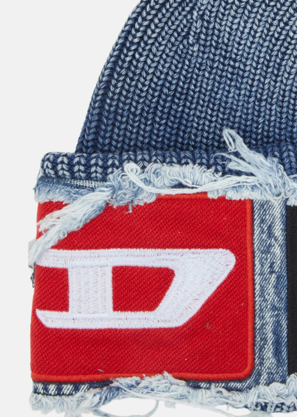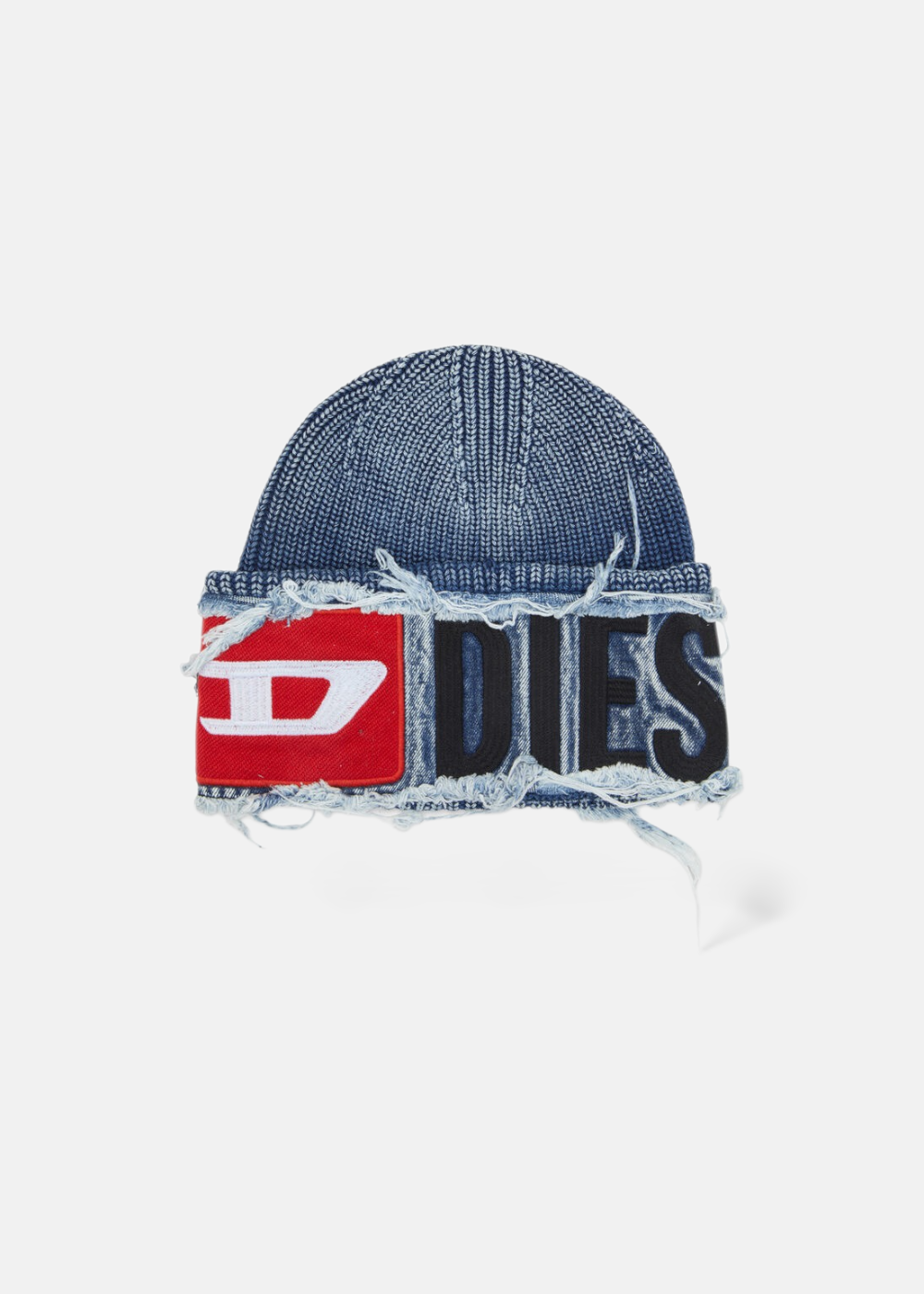 Le bonnet K-Frok affiche un effet denim délavé et un logo Diesel brodé aux bords effilochés. Chaud, confortable et facile à porter, il complète parfaitement un look Diesel casual ou street.