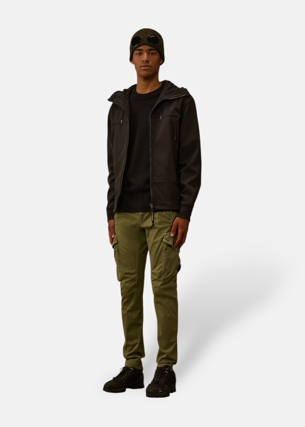 Veste Goggle C.P. Company en softshell Shell-R 3 couches recyclé certifié GRS. Étanche, coupe-vent et respirante, avec capuche Goggle iconique, zips pratiques et coupe régulière.