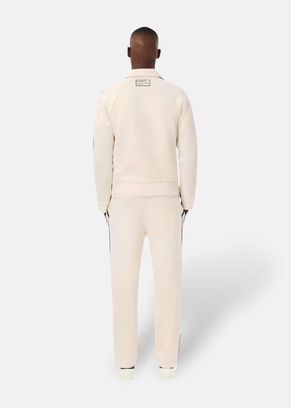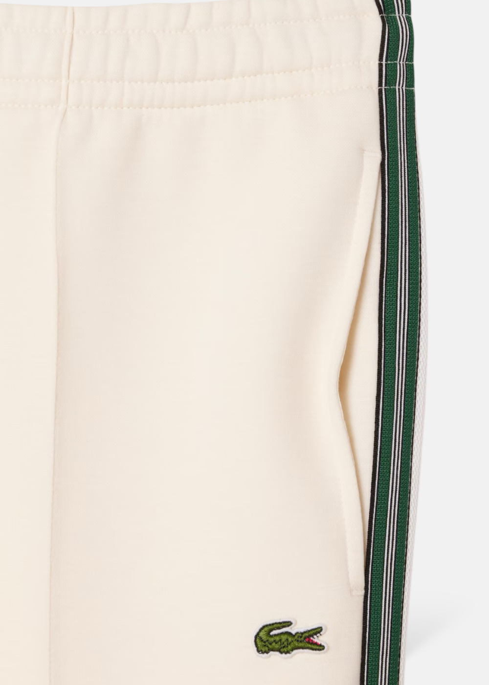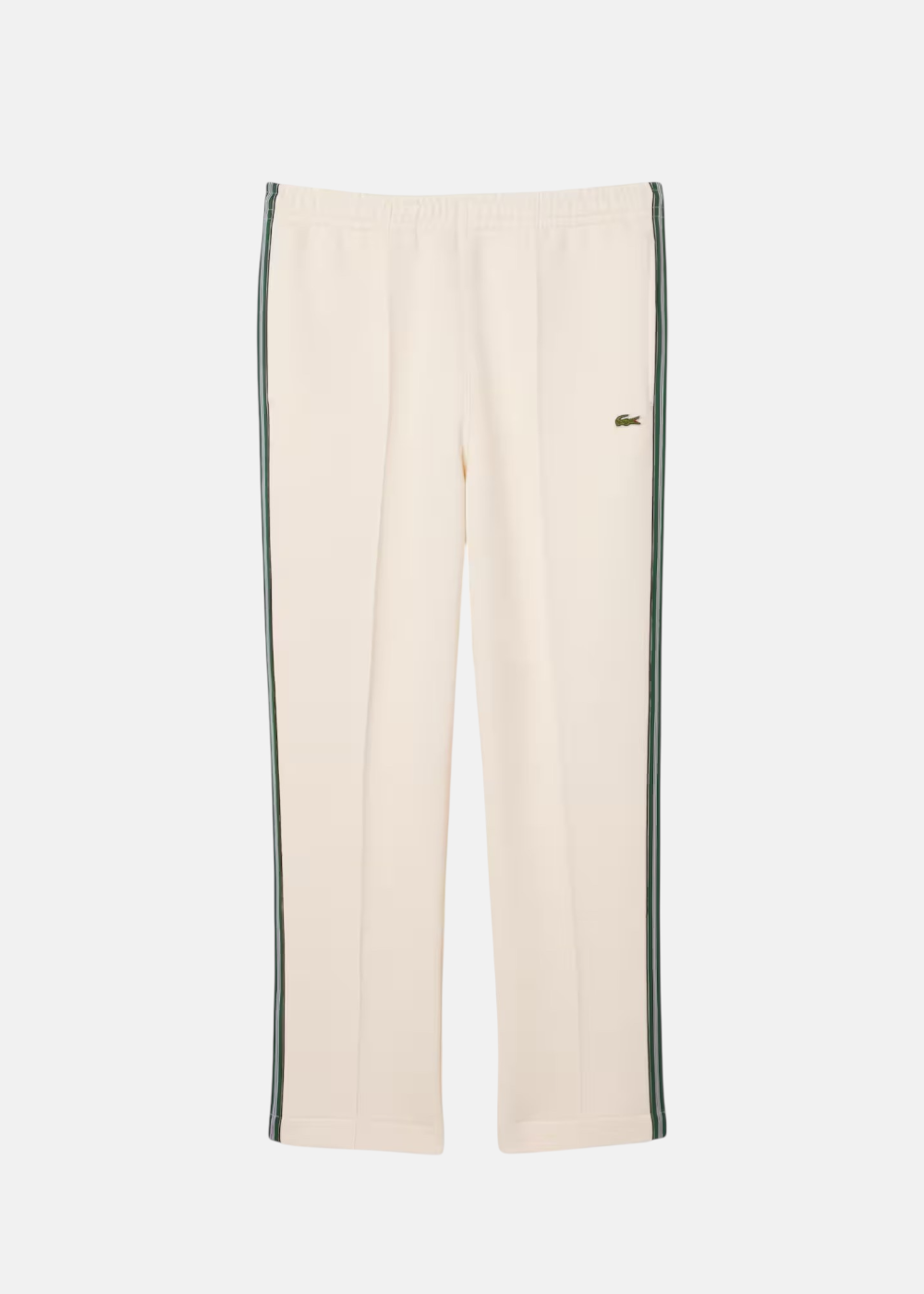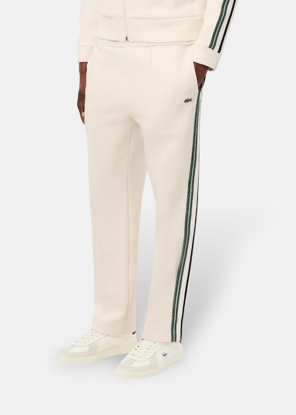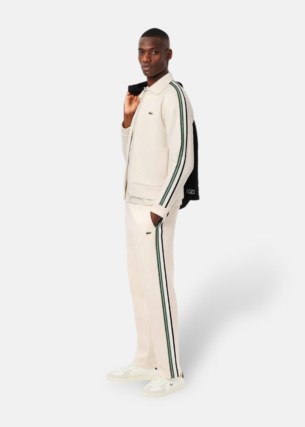 Fabriqué en France, ce pantalon de survêtement Lacoste associe confort et élégance sportive. Son jersey coton double face, ses plis cousus et ses bandes rayées contrastantes en font une pièce premium.